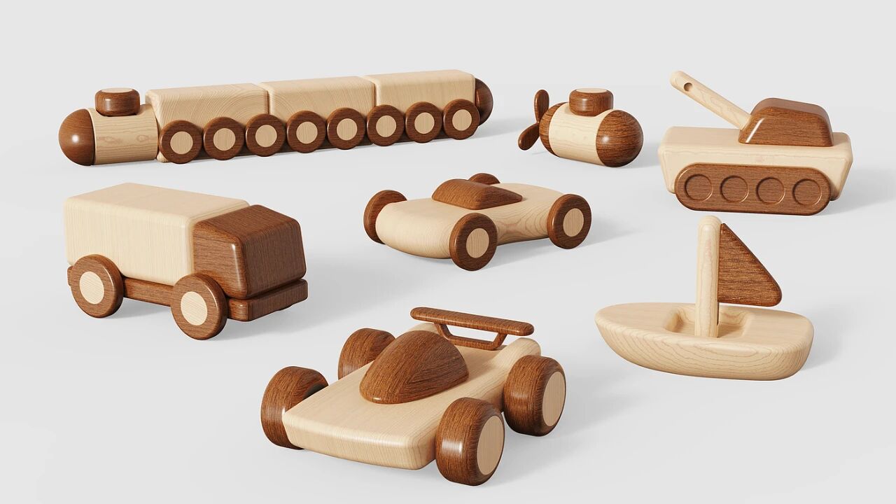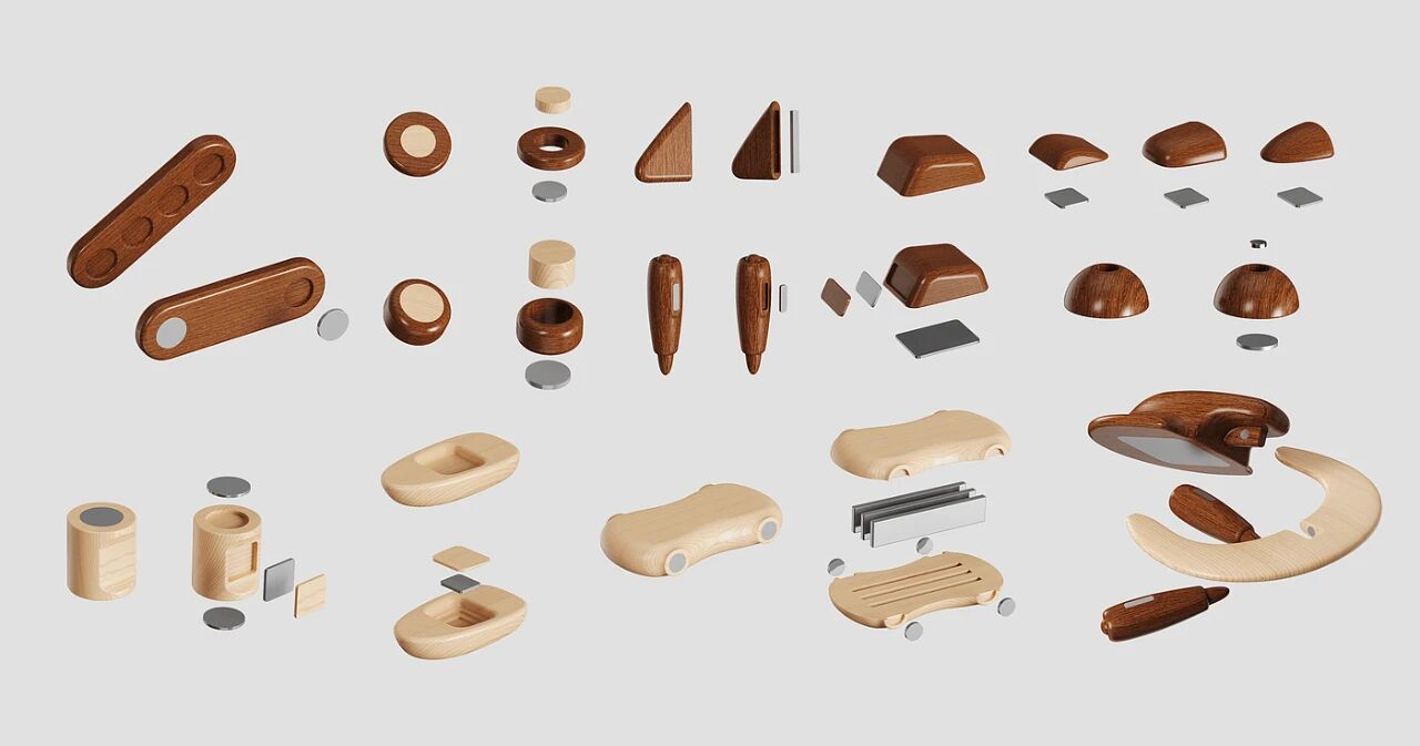 将交通工具分解并抽象成几何形态,这些几何形态分为主体和零件两类共30个基础部件。这些部件由沙比利木和枫木制作,内部置入磁铁,使部件相贴即可固定。