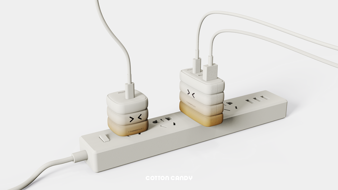 这款棉花糖充电头,从棉花糖圆圆饱满的外形取得想法设计给人软绵绵的感受,配色来自烤棉花糖,以及其他配色不同口味的棉花糖;包装上也应用类似食品包装,增加趣味性;成为人们桌面上的小装饰。